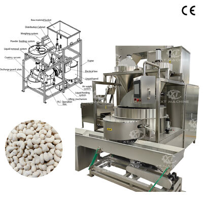 সিস্টেমটিতে একটি বেস পণ্য সরবরাহ হপার রয়েছে যা বায়ুসংক্রান্তভাবে নিয়ন্ত্রিত স্লাইড গেট সহ যা PLC-নিয়ন্ত্রিত ওজন স্কেলে পণ্য সরবরাহ করে। সঠিকভাবে পরিমাপ করা ব্যাচগুলি তারপরে কোটিং চেম্বারে খাওয়ানো হয় যেখানে ঘূর্ণন বেস পণ্যটিকে চেম্বারের দেওয়ালে নিয়ে যায়।